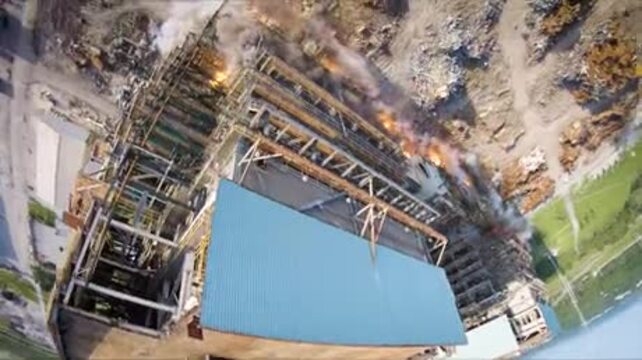 pierwsze ujęcie, beczka nie od tej strony, drugie powinno się skupić bardziej na budynkach a nie pierwszoplanowym terenie z gruzem/ zbyt długi przerywnik / , trzecie komin fajny, ale zajmuje ponad połowę czasu,