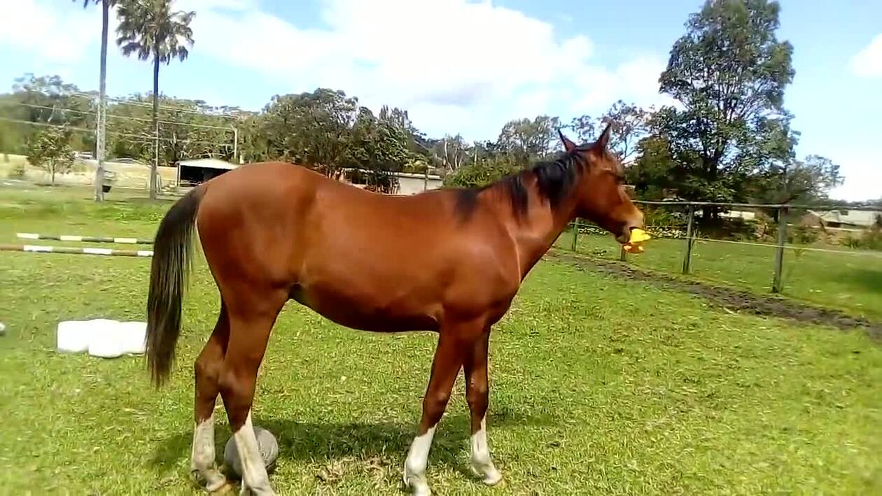Koń wykonuje gryzienie kurczaka