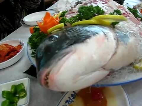 ] Te ryby to nic innego jak popularne i u nas karpie. Są żywe i nie mają przerwanego rdzenia kręgowego [jak ktoś wyżej wspomniał]. Przygotowuje się je w ten sposób, że przecina się skórę nad skrzelami; w woku lub patelni trzeba rozgrzać baaardzo mocno tłuszcz [co najmniej 200'C](najlepiej olej ryżowy, lub arachidowy, ew. masło klarowane z braku powyższych). Trzymając szczypcami za głowę wkładamy je na gorący tłuszcz (ale tylko część poniżej skrzeli, inaczej ryba nam umrze!) i smażymy krótko, tak by zewnętrzne warstwy mięsa zostały usmażone. Podajemy od razu wykładając na ciepły talerz. Zjada się tylko mięsko powyżej skrzeli, głowy, oraz podrobów oczywiście nie ruszamy.