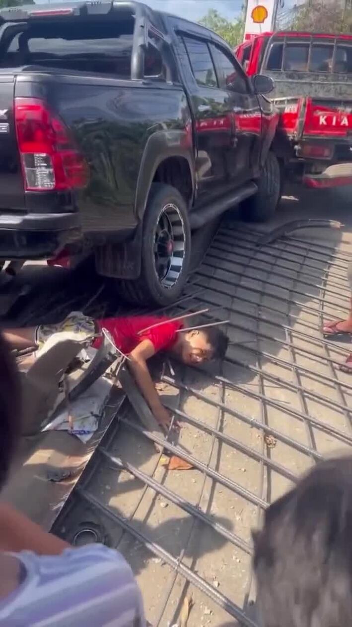 Nie widzę dokładnie ale wydaje mi się że wcale nie jest nadziany tylko jakby wprasowany między zbrojenie. Możliwe że to zbrojarz, kręcił zbrojenie w środku i najechał na niego samochód, a nie spadł z góry nadziewając się