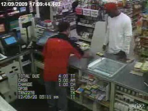 Hej! Jaki bandyta?! Za batona zapłacił nie? Kasjer wydaje mu tylko resztę, po tym jak koleś grzecznie zapłacił... Moneta w kasie zostaje. Toż to normalny gość, a nie bandyta. Policjantka go pewnie goni bo sprzedawca przeoczył jeszcze jedną stówkę w kasie i chciała mu ją oddać. I co w tym dziwnego?