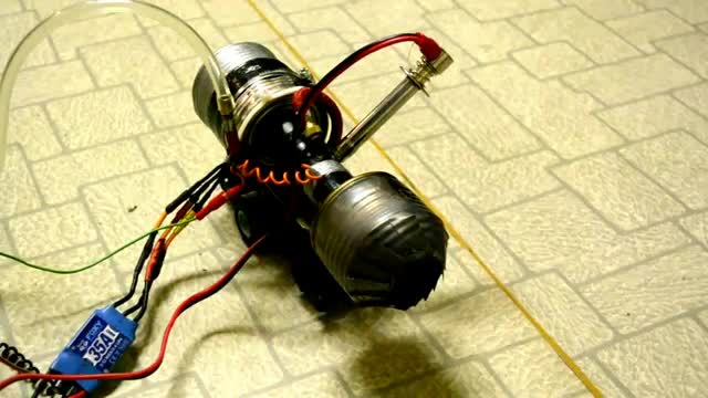 Uwaga modelarz się wypowiada ! Na załączonych obrazkach widzę puszki, kabelki i kilka rurek, oraz to niebieskie z magicznym napisem 35A. Jest to regulator obrotów silnika modelarskiego 3f (działa jak komutator w silnikach na prąd stały, tyle że to układ elektroniczny którym jest regulator odpowiednio załącza zwoje) i z nabytej wiedzy wiem że jeśli ten silniczek którego tam trochę wystaje pobierałby na maks obrotach jedynie 25A to i tak mógłby mieć ok 1kg ciągu. Tutaj mamy do dyspozycji ponad 30, doprowadzenie paliwa do powietrza, które zapala ta świeca no i dysza. Wynika więc z tego że jest to pełnoprawny silnik odrzutowy, z tym że płomień nie powinien raczej dotykać dyszy przy dobrym jej uformowaniu ;D