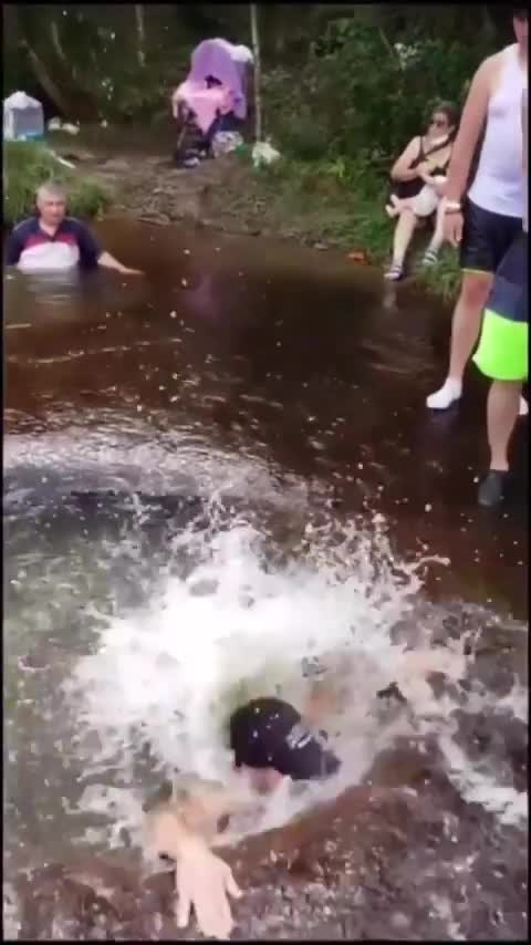 Skacze na pewniaka nie znając gruntu to ma. Zęby górnej i dolnej szczęki możliwe się zazębiły, może tylko kilka uszczerbił... I musi się najpierw obudzić pod wodą by to stwierdzić bo raczej dostał K.O. i poszedł lulu.